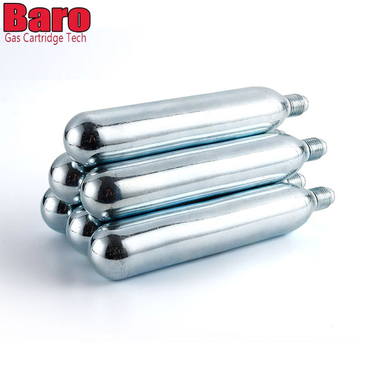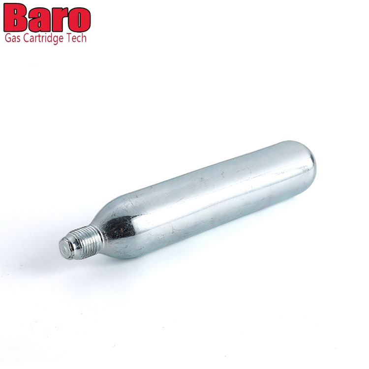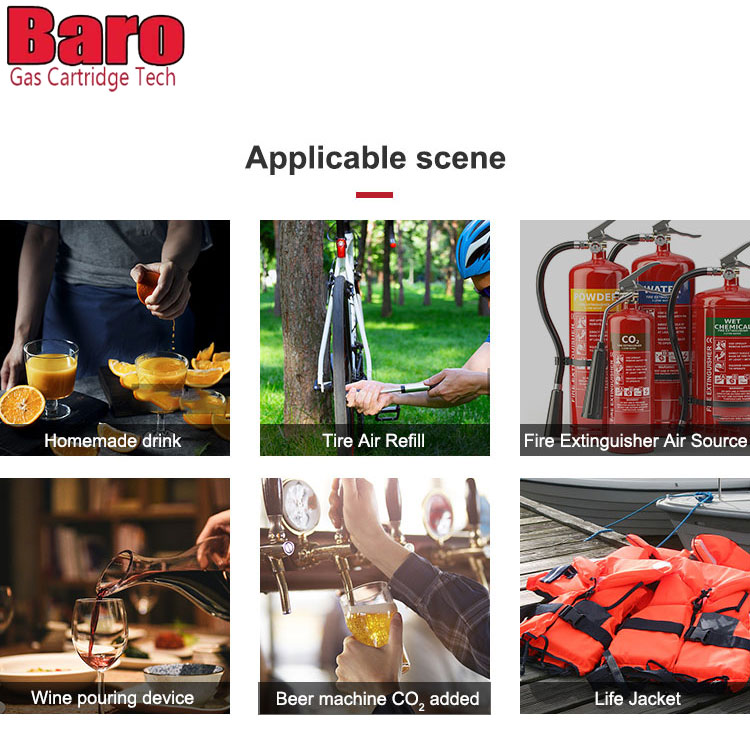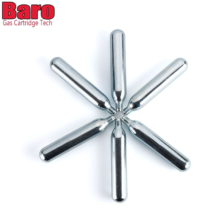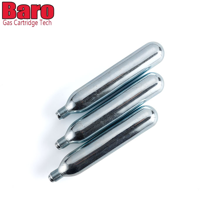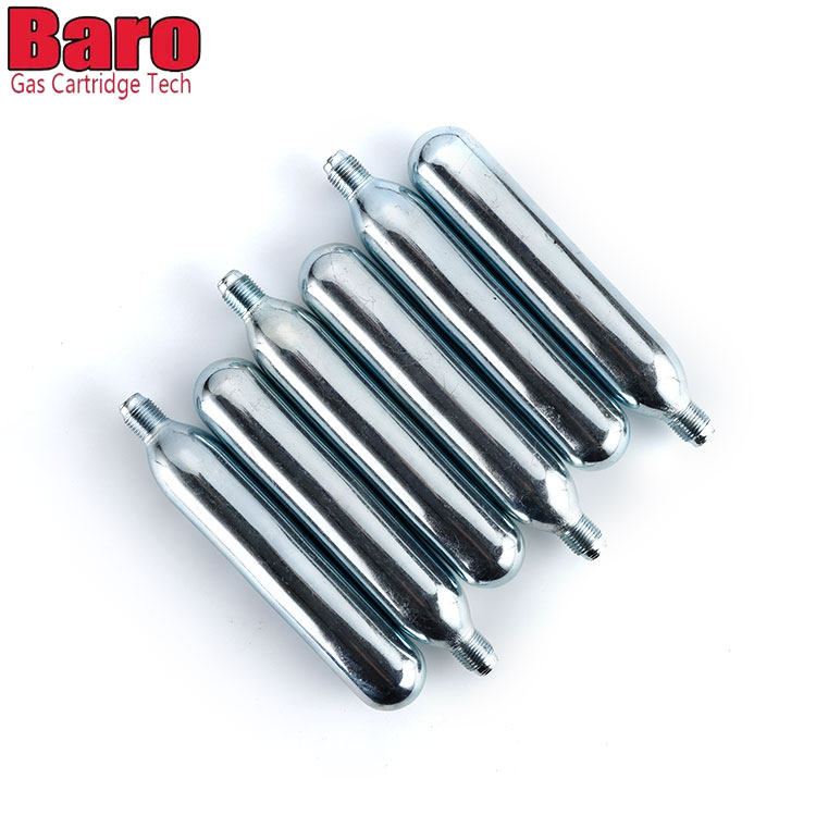 Baro CO2 cartridges in variis machinationibus - ex vino carbonatori ad bicyclum inflatores fatigant. Capsulae campestris albae cum nullo logo, salus in ea notitia. Salutis indicium in cartridge impressum est.